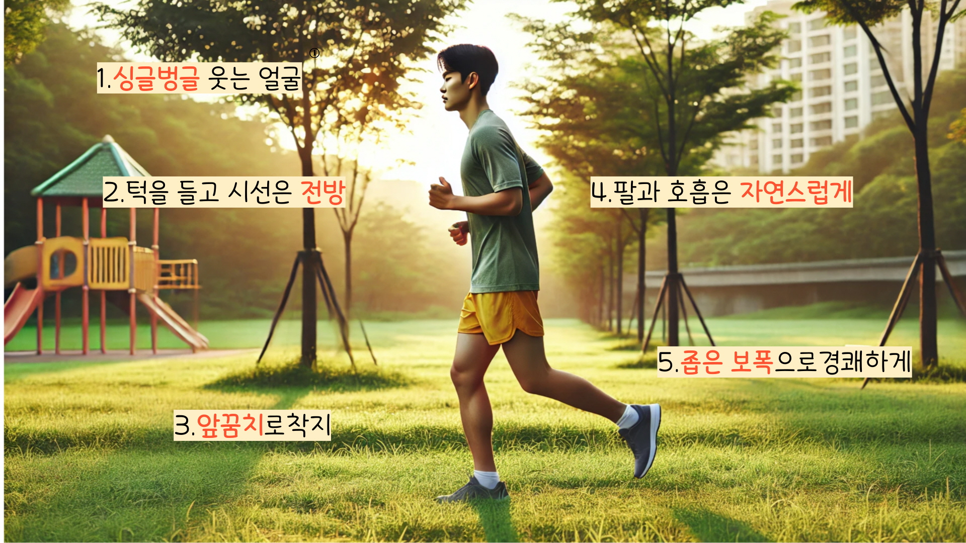 상체를 살짝 앞으로 기울이고, 발 뒤꿈치가 아닌 발 앞부분으로 가볍게 디디며 달려보세요.